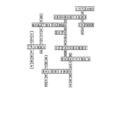 По горизонтали: 1Какой термин использовал М.В. Ломоносов для обозначения обучающихся? (студент) 2 Какой процесс коснулся не только публицистической, общественно – бытовой лексики, но и научной, при котором происходило не просто заимствование понятий, а их приспособление, иногда смешение?(европеизация) 3 какие термины закрепились в русском языке после попытки упростить терминологию путем калькирования иностранных терминов? (международные) 4 Точно ограниченные в научном и практическом смысле слова обозначения педагогических понятий? (термин) 5 Понятие, используемое М.В. Ломоносовым в своих работах для обозначения школьного оборудования? (перо) 6 Какой термин М.В. Ломоносов связывал с добросовестным отношением детей к познанию предметов? (учение) 7 Какое понятие чаще использовали в качестве синонима «просвещение» в педагогическом смысле в ломоносовский период? (образование) 8 Какой термин отсутствует в педагогических произведениях ломоносовского периода? (педагогика) 9 Какой термин М.В. Ломоносов не просто употреблял, а дал ему научное толкование, в отличие от своих предшественников широко им пользовался, хотя изредка применял слово «научение»? (воспитание)