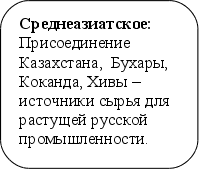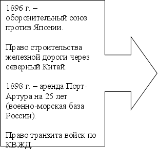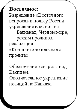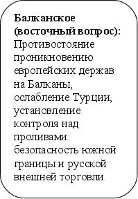 Стремление упрочить позиции на Балканах, взять под контроль проливы. Расширение влияния на Дальнем Востоке (в Китае – строительство КВЖД и ЮВЖД на Пекин, подавление «боксерского» восстания, аренда Порт-Артура). |