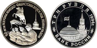 Монета «3 рубля», посвященная 50-летию разгрома немецко-фашистских войск под Ленинградом. Сплав меди и никеля; диаметр 33,00мм; толщина 1,2мм.