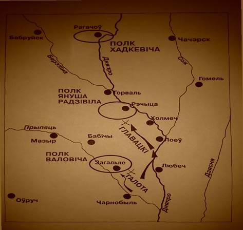 После разгрома войска Небабы главные силы Радзивилла стали лагерем в Любече. Гонсевский с частью наемников и шляхтичей переправился на правый берег Днепра и остановился южнее Чернобыля.[28;c.309]