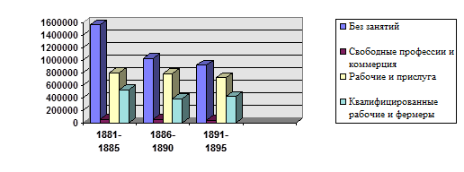 Социальный состав иммигрантов оставался довольно стабильным на протяжении последних десятилетий прошлого века. Это хорошо видно на Графике 3 , который представляет численность иммигрантов по некоторым профессиональным категориям. Интересен контраст с предыдущим графиком: несмотря на смену этнических групп, составляющих основу иммиграционного потока, до 1895 г. незаметен резкий сдвиг в занятости. Бросается в глаза значительное уменьшение количества иммигрантов без определенных занятий, что может объясняться как запрещением китайской иммиграции в 1882 г., так и принятием запрета на ввоз законтрактованных рабочих из Европы тремя годами позже.