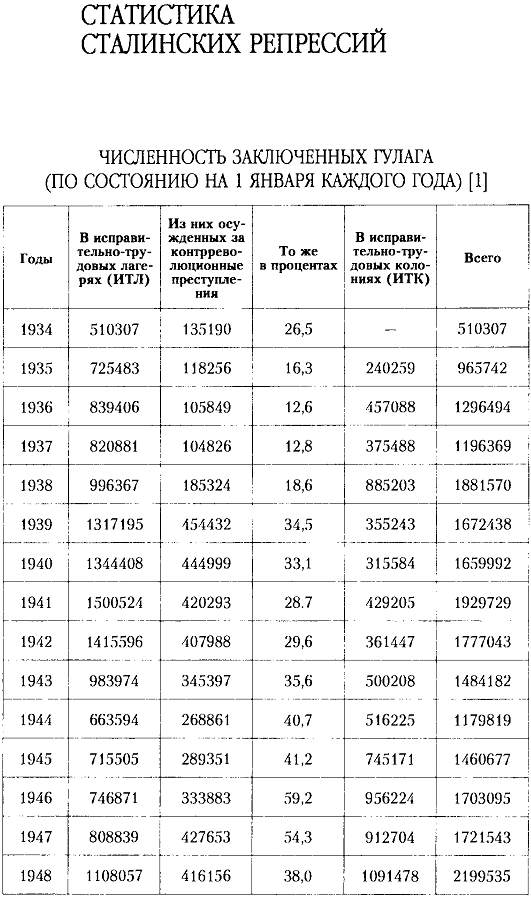Для наглядности хочется представить таблицу, в которой дана статистика политических репрессий в 30-50-х годов XX века. В ней отображено количество заключенных в исправительно-трудовых и исправительно-трудовых колониях на 1 января каждого года. Анализируя данную таблицу, видно, что с каждым росло число заключенных в лагерях ГУЛАГа.