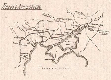 В феврале 1918 г. Дроздовский, по всей видимости, задумывался о маршруте похода, но представлял его лишь приблизительно. Основываясь на данных карты (см. Приложение 1), можно увидеть, что Дроздовский с отрядом заведомо обошел «красную» Одессу и ее округу (как и занятый немцами Таганрог в конце перехода), в остальном же конкретные тактические ходы определялись им по ходу событий, исходя из стратегической обстановки.