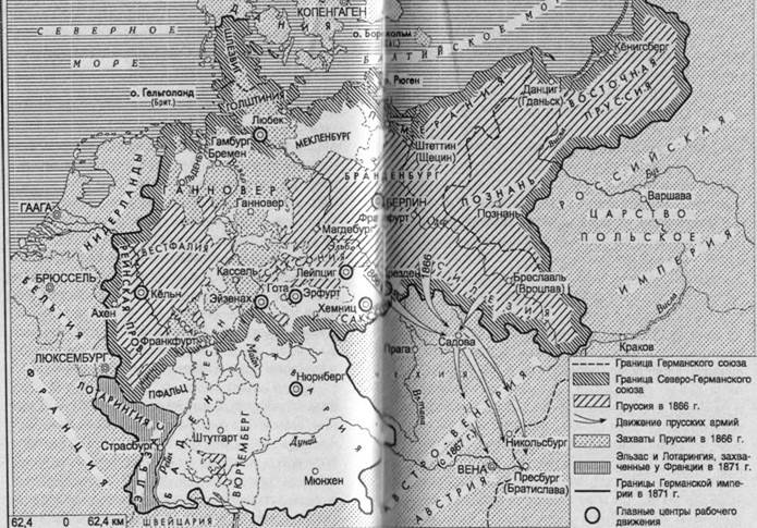 Линия на объединение Германии сверху под главенством Пруссии добилась значительного, хотя еще и не окончательного успеха. В начале 60-х годов в Германии сложилась ситуация, когда выполнение одной из необходимейших задач буржуазного преобразования – создания единого национального государства – стало неотвратимым. И в этот момент консервативный юнкер Бисмарк, олицетворяя собой и историческую необходимость, и определенные социальные силы, принялся за осуществление буржуазной задачи объединения страны.