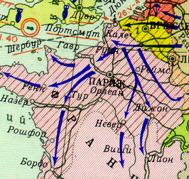 На рассвете 10 мая 1940 после тщательной подготовки нем.-фаш. войска (135 дивизий, в т. ч. 10 танк. и 6 моторизов., и 1 бригада, 2580 танков, 3834 самолёта) вторглись в Бельгию, Нидерланды, Люксембург, а затем через их терр. и во Францию. Гл. удар массой подвижных соединений и авиации немцы нанесли через Арденнские горы в обход “линии Мажино” с С., через сев. Францию к побережью Ла-Манша. |