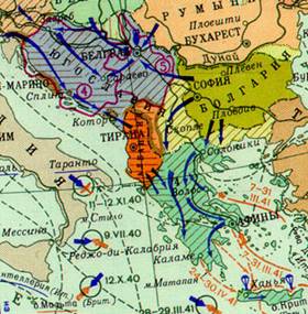 Готовя нападение на СССР, фаш. Германия весной 1941 осуществила агрессию на Балканах (см. Балканская кампания 1941). 2 марта нем.-фаш. войска вступили в Болгарию, присоединившуюся к Берлинскому пакту; 6 апр. итало-германские, а затем венг. войска вторглись в Югославию и Грецию и к 18 апр. оккупировали Югославию, а к 29 апр.— материковую часть Греции. На терр. Югославии были созданы марионеточные фаш. “гос-ва”— Хорватия и Сербия. |
