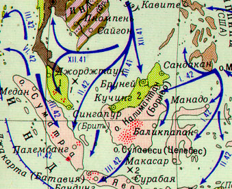 Выведя из строя гл. силы Тихоокеанского флота США в Пёрл-Харборе, япон. вооруж. силы затем оккупировали Таиланд, Сянган (Гонконг), Бирму, Малайю с крепостью Сингапур, Филиппины, важнейшие о-ва Индонезии, захватив обширные запасы стратегич. сырья в зоне южных морей. |