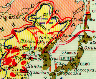 6 и 9 авг. США сбросили атомные бомбы на Хиросиму и Нагасаки, убив и искалечив ок. '/4 млн. мирных жителей. Это было варварское злодеяние, не вызванное требованиями войны и служившее лишь цели запугать др. народы и государства. Вооруж. силы Японии продолжали сопротивление. Вступление в войну против Японии Советского Союза 9 авг. 1945 решило её исход в пользу союзников. Советские войска на Д. Востоке для ведения боевых действий против Японии были сведены в 3 фронта — Забайкальский, 1-й и 2-й Дальневосточные, которые имели 76 дивизий, 4 танк. и механизированных корпуса и 29 бригад. Совместно с сов. войсками, действовали монг. соединения. Всего в составе группировки находилось св. 1,5 млн. чел. Япон. войска, сосредоточенные в Маньчжурии, Корее, на Сахалине и Курильских о-вах, насчитывали 49 дивизий и 27 бригад (всего 1,2 млн. чел.). В результате быстрого разгрома япон. Квантунской армии сов. войсками были освобождены сев.-вост. часть Китая, Сев. Корея, Сахалин и Курильские о-ва (см. Советско-японская война 1945). Успешные действия Красной Армии стимулировали развитие широкого нац.-освободит. движения в Юго-Вост. Азии. 17 авг. 1945 была создана Индонезийская Республика, 2 сент.— Демократическая Республика Вьетнам.