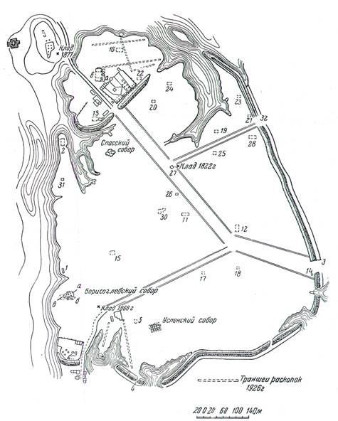 Борисоглебский собор, а — раскопки 1836 г.; б — раскопки 1926 г.; в — раскопки 1948 г. Спасский собор — раскопки 1888 г. Успенский собор — раскопки 1949 г. 1 — раскоп 1945 г. № 1; 2 — раскоп 1945 г. № 2; 3 — разрез вала у Новых Пронских ворот 1945 г.; 4 — разрез вала 1945 г.; 5.— раскоп 1946 г. №1; 6 — раскоп 1946 г.; № 2; 7 — раскоп 1948 г. № 2А; 8 — раскоп 1948 г. № 2Б; 9 — раскоп 1948 г. № 2В; 10—раскоп 1949 г. № 2Г; 11 — раскоп 1946 г. № 3; 12 — раскоп 1946 г. № 4; 13 — раскоп 1946 г. № 5; 14 — шурф 1946 г.; 15 — раскоп 1949 г. № 1; 26 — раскоп 1949 г. № 2; 17 — раскоп 1950 г. № 1; 18— раскоп 1950 г. № 2; 19 — раскоп 1950 г. № 3; 20 — раскоп 1950 г. № 4; 21 — раскоп 1950 г. № 5; 22 — раскоп 1950 г. № 6; 23 — раскоп 1950 г. № 7Б; 24 — раскоп 1950 г. № 8; 25 — раскоп 1950 г. № 9; 26 — раскоп 1950 г. № 10; 27 — раскоп 1950 г. № 11; 28 — раскоп 1950 г. № 12; 29 — раскоп 1950 г. № 13; 30 — раскоп 1950 г. № 14; 31 — раскоп 1950 г. № 15; 32 — разрез вала у Исадских ворот 1950 г.