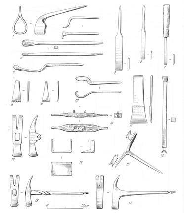 Довольно широкий набор разнообразных инструментов применялся при фигурной обработке дерева и художественной резьбе . Найдены стамески — прямые и косые, стамески с фигурным лезвием, долота с фигурными лезвиями, разнообразные резцы — такие, как клюкарзы с прямым и фигурным лезвием, ножи-косяки и ножи-резаки, ложкари. (рис. 12) [ 6 – стр. 258 ] .