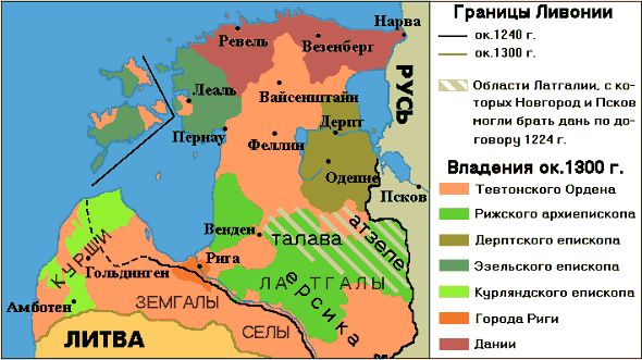 Полоцкие походы 1203 и 1206 гг. не смогли остановить продвижение немцев, которые вскоре двинулись вверх по Даугаве в земли южных латгалов, зависевших от русских князей, вассалов Полоцка. Эти области были покорены военными и дипломатическими методами (1207-1215 гг.). В дальнейшем немцы обратились на восток и северо-восток. Путем дипломатии и религиозной пропаганды они распространяют свое влияние на северных и восточных латгалов из Толовы и соседних областей (1208-1214 гг.). В упорных войнах 1208-1227 гг. завоевывается Эстония. Здесь создаются в 1224 г. епископство Дерптское (Дорпатское, Тартусское) и в конце 1227 или начале 1228 г. – Эзельское (Эзель-Викское, Сааре-Лэнемааское).