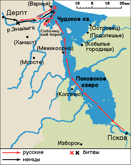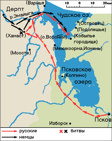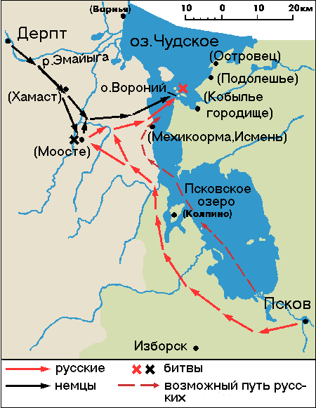 Значительное место при реконструкции движения многие отводили поиску места поражения русского сторожевого отряда. Сначала прямолинейно считали, что отряд Кербета и Домаша был разбит у моста через нижнее течение р.Эмайыга или какую-нибудь другую реку. Бунин впервые предположил, что "мост" – это искаженное название эстонского селения . Он отождествил его с Хамастом (Hammast, Hamast) в восточной Эстонии. Александр предпринял наступление на Дерпт, а после боя у Хамаста отступил вдоль р.Эмайыга к озеру и далее по льду к островам в его юго-восточной части, где и произошло сражение (Рис. 5).