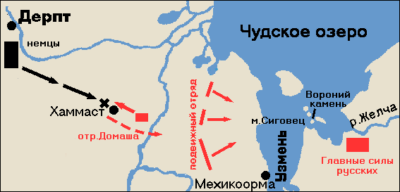 По Караеву Г.Н., князь не вел масштабных операций в дерптских владениях, а сразу расположился на русском берегу северо-восточной части Теплого озера . Он не уточнял, какой дорогой армия достигла этого места, но, возможно, подразумевался путь по льду Псковского озера и далее к устью р.Желча. Основные силы русских не переходили на немецкий берег. Часть воинов была отправлена в набег. Отряд Домаша был разбит у Хамаста (Рис. 8). После этого немцы прошли через северную часть Теплого озера к м.Сиговец, где их встретили основные силы Александра.