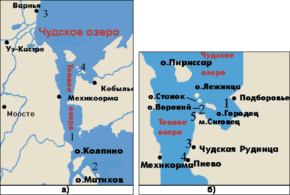 Для места генеральной битвы летописи дают достаточно точные указания, но их интерпретация представляет нелегкую задачу, так как исчезли упоминаемые в летописях географические названия. Из-за этого существует больше десятка локализаций Ледового побоища в различных местах на юге Чудского озера, а также на Теплом и Псковском озерах, как у русского, так и у эстонского берегов. Наиболее существенные приведены на Рис. 9 .