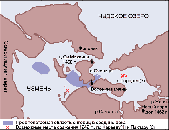Совокупность данных позволяет считать, что Ледовое побоище произошло у русского берега древнего Теплого озера (Узмень), не очень далеко от современного о.Вороний. При этом граница Узменя могла проводиться несколько севернее современной границы Теплого озера и включать в себя Желческий залив. Из-за наличия сиговиц отпадает локализация битвы Беляевым вблизи Больших ворот, к западу от о.Вороний. Остаются два основных варианта, Караева и Паклара. Караев поместил место сражения у м.Сиговец, в 1,5 км к юго-западу от о.Вороний.