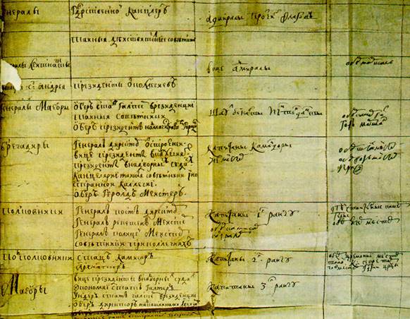 Табель о рангах всех чинов, воинских, статских и придворных, которые в котором классе чины; и которые в одном классе, те имеют по старшинству времени вступления в чин между собою, однако ж, воинские выше прочих, хотя б и старее кто в том классе пожалован был[53]