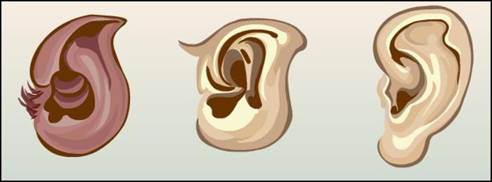 Рис.10. 1 - остроконечное ухо обезьяны; 2 – ухо человеческого зародыша; 3 – Дарвинов бугорок на ухе взрослого человека. Утолщение ушной раковины (Дарвинов бугорок) – остаток остроконечного уха предков человека.