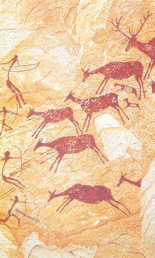 Древнейшие наскальные изображения (30—21-е тыс. до н. э.) представляли собой обведённые по контуру кисти рук или их отпечатки. В пещерной живописи параллельно с реалистическими изображениями существовали абстрактные. Наскальные изображения животных (бизонов, мамонтов, оленей и т. п.) поражают выразительностью метко схваченного облика и точно переданными повадками (пещера Ласко, Франция). В палеолитической живописи каждая фигура значима сама по себе, вне зависимости с другими; древним художникам было неведомо понятие композиции. Возможно, изображаемые звери представляли собой тотемы – священных животных, согласно древним верованиям, родоначальников рода и объект почитания племени. Вероятно также, что наскальные рисунки изображали животных, на которых охотились первобытные люди; в этом случае живопись выполняла роль магического обряда, при помощи которого охотник надеялся убить реального зверя, «поражая» его нарисованного двойника (на многих рисунках обнаружены следы от ударов копья). Видимо, поэтому наскальные росписи размещались специально в глубине пещеры, как бы в особом святилище. ![]()