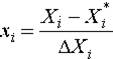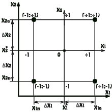 Для гарантированного получения единственного решения системы нормальных уравнений необходимо иметь ортогональную матрицу планирования, что невозможно обеспечить в абсолютной системе единиц факторов X i , то есть тогда, когда факторы именованные (например, трудно представить 17 километров ортогональными к 12 килограммам). Поэтому необходимо провести предварительное преобразование каждого фактора - его перевод в систему относительных координат. Такое преобразование легко сделать с помощью переноса начала координат в базовую точку X * и выбора единицы отсчета D X i по каждой координате X i .