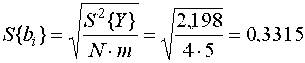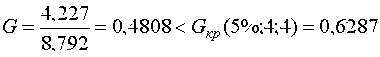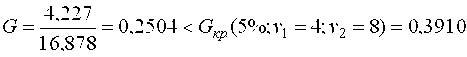 откуда следует, что результаты опытов получены правильно, дисперсия строчных выборок равна S 2 {y} = 8,792 / 4 = 2,198 с числом степеней свободы v 3 = 4·4 = 16.
