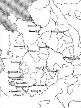 На карте 2 видно, что топонимы типа Ракула, Ракола широко распространены на Севере, но и они фактически отсутствуют на правобережье Северной Двины и в бассейне Мезени (озеро Ракульское IV, вероятно, вторичное образование от Ракула III), а также на Емце, в районе Кубенского озера, на Сухоне, Устье и в других уже названных местах, то есть кар- та 2 в основном дублирует карту 1. Добавим еще, что деревня Ракульское есть и далеко юго-восточнее в Макарьевском районе Костромской области. Возможно, это свидетельство проникновения отдельных групп прибалтийских финнов дальше на юг вплоть до бассейна Волги 12 , хотя в данном случае нельзя исключить и перенос названия на русской почве.