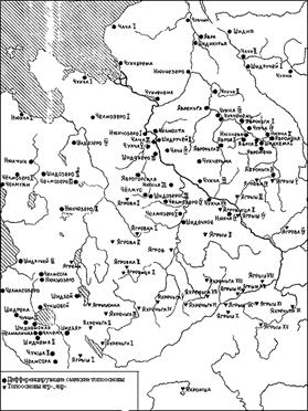 На юго-западе в Белозерье также находим саамскую топонимию с основами чач-, чёлм-, шид- и несколько отличными от северносаамских основами нюкш- и чукш-. Трудно решается вопрос о названии озера у белозерских саамов, соответствующем северному явр- (саам. jawre), а также фин. и карел. jarvi, вепс. jarv ‘озеро’, поскольку в топонимии Белозерья встречаются две разновидности этой основы ярб- (Ярбица, Ярбовской ручей, Ярбозеро) 16 и яр- (Яргора, Ярсолово), при этом первая скорее связана с прибалтийскими финнами, а вторая – с саамами. Ввиду проблематичности и невысокой частотности, оба варианта не картографировались. Но все остальные основы ясно указывают на наличие в топонимии Белозерья саамского элемента.
