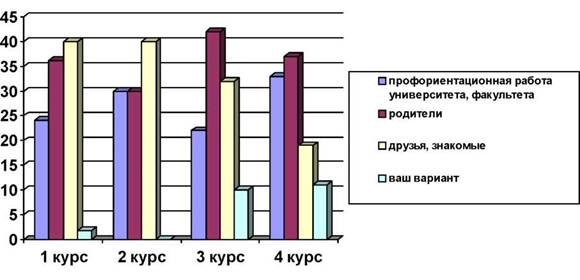Результаты позволяют сделать вывод, что основным источником являются люди - друзья, знакомые, родители, так же большой процент составляет профориентационная работа университета/факультета. По данному вопросу на пункт «Ваш вариант» ответами были такие варианты, как «Интернет», «Справочник абитуриента» и т.д.