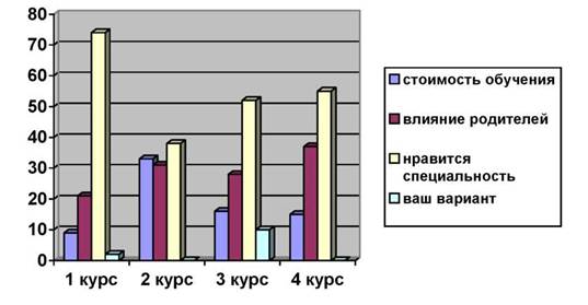 Выбор профессии очень важный шаг в жизни каждого человека. Иногда желание абитуриента не совпадает со взглядами родителей, или на поступление влияют другие причины. Поэтому следующий вопрос анкеты позволял выяснить, какую роль сыграли те или иные факторы при поступлении на данную специальность: