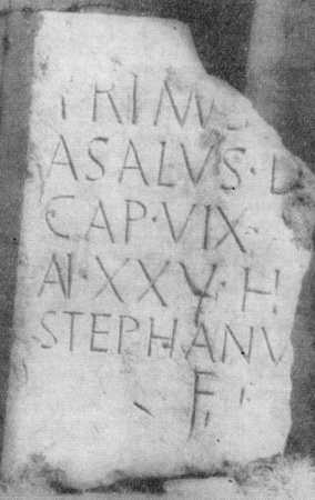 Она дает нам возможность установить имя умершего – Primus, затем его происхождение из Паннонского племени азалов, его военный чин d[upl](iciarius) скорее чем d[ec](urio)21 , войсковую часть (ala) Cap(itoniana) (известную уже по надписи из Августы), время, какое он прослужил,– двадцать пять лет,– и, наконец, имя того, кто позаботился поставить ему памятник, – Stephanu[s].