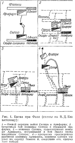 Через 50 лет после Эпаминонда и 20 лет после Александра подобный же маневр, решивший исход битвы при Фате, проделала скифская конница, которой командовал Сатир.