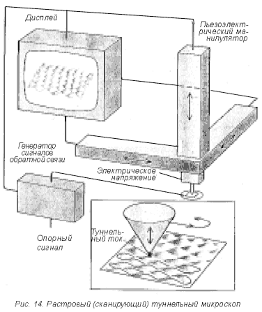 В 1972 г. Р.Янг из Национального бюро стандартов США сумел осуществить перемещение (и позиционирование) объектов в трех направлениях с точностью до 1 нм, использовав перемещающие устройства на базе пьезоэлектриков (о них мы уже говорили в разделе, где описывался ультразвуковой микроскоп). Пьезоэлектрические управляющие устройства открыли путь к созданию одного из современных вариантов микроскопа ближнего поля – растрового, или сканирующего, туннельного микроскопа, изобретатели которого, Г. Бинниг и Г. Рорер, из компании IBM (США) были удостоены Нобелевской премии в 1986 г.
