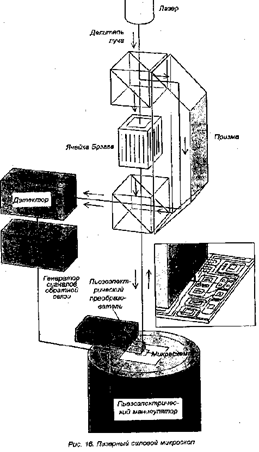 Однако даже усовершенствованные конструкции атомно-силовых микроскопов оказывают все же достаточно большое давление на объект, что может привести к загрязнению или повреждению последнего. Поэтому было разработано новое семейство сканирующих микроскопов с зондами-остриями, среди которых основным следует считать лазерный силовой микроскоп (рис. 16). «Сила», которую чувствует этот микроскоп, – это малая сила притяжения между исследуемой поверхностью и зондом (кремниевым или вольфрамовым), находящимся от нее на расстоянии от 2 до 20 нм. Она складывается из силы поверхностного натяжения воды, конденсирующейся в зазоре между острием и образцом, и слабыми силами Ван дер Ваальса. Притягивающая сила очень мала – в 1000 раз меньше, чем межатомное отталкивание в атомно-силовых микроскопах. При перемещении острие вибрирует с частотой, близкой к резонансной. Лазерно-силовой микроскоп регистрирует силу межатомного взаимодействия по ее воздействию на динамику вибрирующего зонда.
