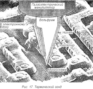 Зонд растрового термического микроскопа является, пожалуй, самым крошечным в мире термометром: он позволяет измерять поверхностные изменения температуры в десятитысячную долю градуса на длине несколько десятков нанометров. Зонд представляет собой вольфрамомую проволочку до 30 нм в поперечнике, покрытую никелем, который отделен от вольфрама слоем диэлектрика везде, кроме самого кончика (рис. 17). Такой вольфрамо-никелевый зонд работает как термопара, генерируя напряжение, пропорциональное его температуре.