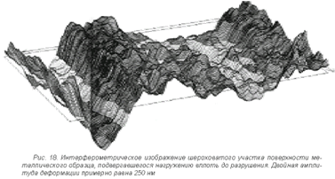 Изменение амплитуды измеряется с помощью сенсорного устройства на базе лазера. Для этого используется другой, уже знакомый нам принцип микроскопии, – интерферометрия. Лазерный луч расщепляется на два: луч сравнения, который отражается от стационарного зеркала или призмы, и зондирующий луч, который отражается от обратной стороны острия. Два луча складываются и интерферируют, порождая сигнал, фаза которого чувствительна к изменению длины пути, пройденного зондирующим лучом. Таким образом, интерферометр измеряет амплитуду вибрации кончика острия амплитудой до 10–5 нм. Рассмотренный принцип позволяет лазерно-силовому микроскопу регистрировать малые неровности рельефа величиной до 5 нм (около 25 атомных слоев).