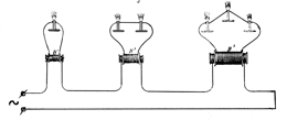 Размеры статьи не позволяют подробно остановиться на открытиях, сделанных с использованием индукторов Румфорфа – этих надежнейших и конструктивно оформленных лабораторных устройств. Но нельзя не упомянуть о трех из них, непосредственно повлиявших на развитие человечества. Это впервые примененные в электрическом освещении катушки в роли трансформаторов. Мы приводим рисунок из патента П.Н. Яблочкова 1877 г. (рис. 5). Приятно осознавать, что русский изобретатель первым применил на практике устройство, позволяющее передавать электроэнергию за тысячи километров от места генерации.