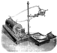 Его прерыватель цепи представляет собой металлическую шестеренку, зубья которой при вращении шестерни периодически контактируют со специальным токопроводящим лепестком. Вращать шестеренку приходится вручную. Несмотря на примитивизм такой конструкции, Массон подмечает очень важную закономерность. Чем с большей скоростью вращать прерыватель, тем длиннее искру можно получить. Следовательно, пациент получает большее электрическое воздействие.