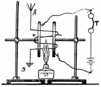 Уже в 1903 г. он произвел очень удачный и перспективный опыт. Две платиновые обкладки воздушного конденсатора «лизало» пламя горелки, а на плазму внутри его действовало поле электромагнитной катушки, включенной между антенной и землей (рис. 1). С помощью этого детектора Ли де Форест принял сигналы с судна, стоящего в Нью-Йоркской гавани. Первый успех окрылил изобретателя. Но применить такое устройство на практике не представлялось возможным. «Было очевидно, что для судовой радиостанции приспособление с газовым пламенем неприемлемо, – записал изобретатель, – поэтому я стал искать способ нагревать газ непосредственно электрическим током». Проще всего для этой цели было использовать обыкновенную эдисоновскую электролампочку, введя туда платиновые пластинки электродов и обернув частью приемной катушки стеклянный баллон лампы. Впоследствии один из платиновых электродов был удален, а вместо него была применена раскаленная нить лампы (рис. 2). Радиоприемник с таким детектором работал не хуже других аналогичных приборов, но и не лучше.