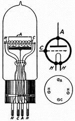 Наиболее удачной оказалась конструкция, в которой роль одного электрода выполняла раскаленная нить накала лампочки, помещенной в другой электрод в виде цилиндра. Между ними и располагался третий электрод, выполненный в виде проволочной спирали (рис. 3). Свое детище изобретатель назвал «аудионом» (от латинского «аудио» – слышать и греческого «ион» – идущий). Качество работы устройства определялось по силе звучания принимаемого сигнала на слух, и она превосходила все применявшиеся до этого приборы. Позже с легкой руки английского электротехника Вильяма Икклза лампы с тремя электродами стали называть триодами.