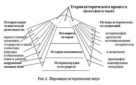 Первый момент. Заслуживает внимания новое определение предмета исторической науки «как упорядоченное изучение прошлого стран, народов, всего человечества, отдельных сторон деятельности общества, помогающее выявить закономерности и тенденции исторического процесса, чтобы лучше понять настоящее и более обоснованно предвидеть будущее» (234. С. 25). Исходя из того, что общество многомерно, а историческая наука поэтому многозвенна, то она представляется в виде пирамиды исторических наук (Рис.1). Одна ее грань – история стран и народов, в более общем смысле – история континентов (Европы, Азии, Африки, Америки) и всемирная история, которая изучает основные этапы развития всего человечества. Другая грань этой пирамиды – история отдельных видов человеческой деятельности – науки, техники, экономики, политических отношений, государства и права, войн, культуры и образования, этики и религии и т.п. Третью грань образуют науки об этапах и методах исторического познания – историография, этнография, археография, источниковедение, археология, историческая статистика, моделирование исторических процессов и т.п. Вершина пирамиды – теория исторического процесса, его общие закономерности и тенденции, методология исторических исследований и т.п. (Там же. С. 26).