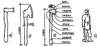Плотницким топором тесали бревна, вырубали в них чаши, выполняли узлы соединения элементов, декоративные детали и многое другое. Плотницкий топор XVII–XVIII вв. существенно отличался от современного. Собственно топор (металлическая часть) был коротким, каплевидным в сечении, лезвие нешироким (9–15 см), полукруглым, утолщенным, с большой клиновидностью (напоминая по форме колун для раскалывания дров, бревен) (рис. 2в), а сам топор тяжелее. Топоры ковали из особо стойкой, высокопрочной стали. Топорище (рукоятка) - длинное и прямое (а не изогнутое, как современное), на конце утолщенное, чтобы не выскакивало из рук. Для топорища выбирали прямую березовую плаху без сучков. Длина топорища была различной, потому что зависела от роста плотника: плотник, поставив топор на землю вертикально около своей ноги, свободно опущенной рукой мог взять в кулак утолщенный конец топорища (рис. 2г). Длинное топорище, являясь по сути рычагом, позволяло плотнику тратить меньше сил.