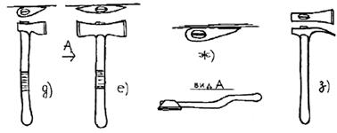 Для обтески бревенчатых стен изнутри помещения применяли специальный топор, лезвие которого было прямым и несколько удлиненным по сравнению с обычным плотницким топором, а само лезвие разворачивали на острый угол так, чтобы ось насадки топорища была параллельна одной грани лезвия (рис. 2д). Топорище для такого топора специально подбирали из тонкого искривленного древесного ствола, чтобы во время работы не обивать кисти рук. В этом случае плотнику требовались два топора, выкованных зеркально, т.е. один со смещением лезвия вправо от плотника, для обтески справа налево, другой - со смещением влево, для обтески слева направо. В углах поверхность бревен вытесывали по дуге. Получался “круглый” угол. Обтеску вели от угла к середине стены. “Правым” топором левую сторону угла, закругленную по дуге, не обтесать. Вместо двух топоров иногда применяли один, но обоюдоострый, двухсторонний, у которого был один проух и два лезвия, выкованные зеркально (рис. 2е). Именно такими топорами отесывали стены архангельские мастера.