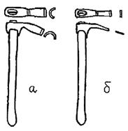 Тесло - по сути дела тоже топор, топорище у которого длинное и прямое, а лезвие не только развернуто перпендикулярно относительно топорища, но и имеет полукруглое сечение, в виде черпачка (рис. 3а). Теслом вытесывали на бревне вдоль его волокон желоба разных размеров (например, неглубокий паз в бревне, предназначенном к укладке в стену, или глубокий водосточный желоб), выполняли участки плавного перехода от круглого бревна к брусу у оконных и дверных проемов, отесывали после топора “круглые углы” в интерьере и другие криволинейные поверхности. Пазник - тесло с нешироким плоским лезвием – служил для окончательной, чистовой выемки пазов после вырубки паза начерно топором (рис. 3б). Как правило, паз сначала вырубали начерно топором до получения П-образного профиля, а затем в глубине паза выбирали древесину пазником.