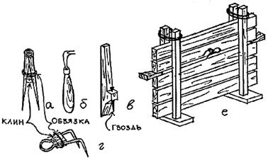 Впоследствии во многих технологических операциях черту и отволоку заменил рейсмус. “Рейсмус” - слово немецкое, буквально означает “инструмент для проведения параллельных линий” (вспомним: рейсмусовый станок, рейсшина). Рейсмус использовали также для перенесения размеров с одних деталей на другие. Принцип его действия аналогичен: прочерчивание на древесине царапины острой шпилькой, только вместо кольца и клинышка, как у черты, у рейсмуса подвижная колодка, которую фиксируют винтом (рис. 4з). (Кстати, иностранными названиями инструментов, в основном голландского и немецкого происхождения, русская строительная технология обязана венценосному плотнику Петру I.)