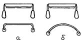 Для чистовой, после топора, окорки бревен и снятия заболони применяли струг, или скобель (от “скоблить”). Этот инструмент представлял собой скребок, серпообразную металлическую пластину с режущей кромкой и двумя рукоятками. В некоторых местностях средней полосы России этот скребок называли хаком (от натужного звука “ха”, издаваемого плотником при работе этим инструментом) [15]. Существовали два его вида: прямой и закругленный (кривой) (рис. 5а, б).