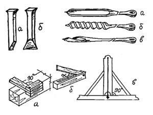 Наугольник применяли для отбивки только прямого угла (рис. 8а); малка – тот же наугольник, но с одной подвижной кромкой - применялся для снятия и обозначения различных углов (рис. 8б). Складной аршин (позднее метр) плотнику тоже необходим. Все остальные вспомогательные приспособления плотники делали сами по ходу работы (отвесы, шнурок, клинья и т.п.).