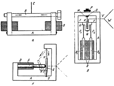 В третьем варианте магнитострикционного громкоговорителя (рис. в) применена схема с двумя железными стержнями B1 и B2, обмотки D которых подключены таким образом, что, когда намагниченность одного стержня увеличивается, намагниченность другого уменьшается. Тягами C1 и С2 стержни соединены с коромыслом G, подвешенным на штанге М и прикрепленным растяжками F к боковинам магнитного ярма А. Коромысло жестко связано с диффузором W. Завинчивая гайку Р на штанге М, систему переводят в состояние неустойчивого равновесия. Благодаря противофазному намагничиванию стержней B1 и B2 током звуковой частоты их деформации также совершаются в противофазе - один сжимается, другой удлиняется (сжатие ослабляется), и коромысло в соответствии со звуковым сигналом перекашивается, поворачиваясь относительно точки R. В этом случае также за счет использования "скрытой" неустойчивости происходит усиление амплитуды магнитострикционных колебаний.