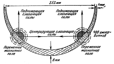 Мы видим, что переменное электромагнитное поле эйнштейновской обмотки центрирует и поддерживает гиросферу; оно принимает на себя ту часть ее веса, которая не скомпенсирована архимедовой выталкивающей силой. Недаром эту обмотку конструкторы назвали обмоткой "электромагнитного дутья": подобно тому как воздушная подушка создается воздухом, нагнетаемым вентилятором, так и электромагнитное поддерживание можно образно представить себе "выдуванием" обмоткой магнитных силовых линий.