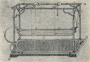 Овальная, покрытая оловом громадная «сковородка» площадью около четырех квадратных метров (!!!) была наполнена застывшим расплавом смолы м воска. Она лежала в основании электрофора. На ней на стойках высотой более двух метров на канатах, пропущенных через блоки, висела другая сковородка-диск, площадью чуть поменьше. Габариты всей машины составляли 3 х 2, 5 х 1.5 метров. (Рис.1). Простим средневековому художнику графические недоработки. Начертательная геометрия, позволяющая изображать трехмерные рисунки на плоскости появятся только в 1799г.