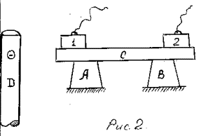 На двух стеклянных стаканах А и B устанавливается металлический брусок С длиной в полметра. На концах этого бруска ставятся два других грузика-брусочка 1 и 2. (Рис.2). Если со стороны первого грузика поднести (не касаясь) натертую сургучную палочку, то можно убедиться снимая грузики, что они заряжепны. Первый положительным, Второй отрицательным элетричеством. Причем такую операцию не натирая больше сургучной палочки можно производить сколько угодно раз. У сургуча заряд не уменьшался. В принципе машина для заряжания тел электричеством была готова.. Можно было вместо грузиков на брусок ставить любые тела, подлежащие электризации и наэлектризовывать их. Ну чем не вечный двигатель?