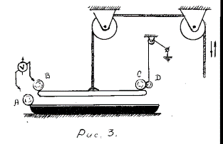 Мы же специально упростили чертеж, чтобы разобраться в принципе работы машины. (Рис.3) Пара сковородок-дисков, изолированных шелковыми веревками друг от друга, являют собой воздушный конденсатор переменной емкости. Напомним, что емкость конденсатора обратно пропорциональна расстоянию между пластинами. Чем меньше расстояние, тем больше емкость и наоборот. Изменялась емкость экспериментатором подъемом и спуском подвешенной сковородки. Для съема зарядов к верхней части подвижной сковородки припаивался медный шар В, для нижней А.